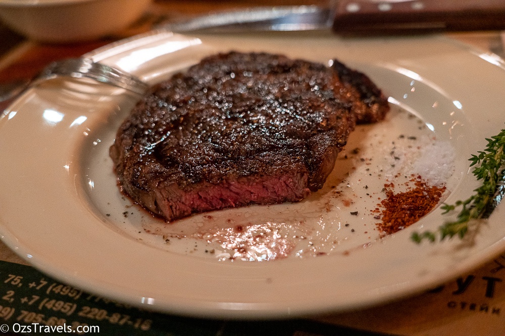 I chose for my main a Russian Bred 200 Day Grain Fed Rib-Eye. I like to see if the staff of a restaurant know what they are doing so ask them to advise the correct “doneness” for a cut. The team at Butcher Steak House Moscow know their stuff, recommending medium rare for this cut.