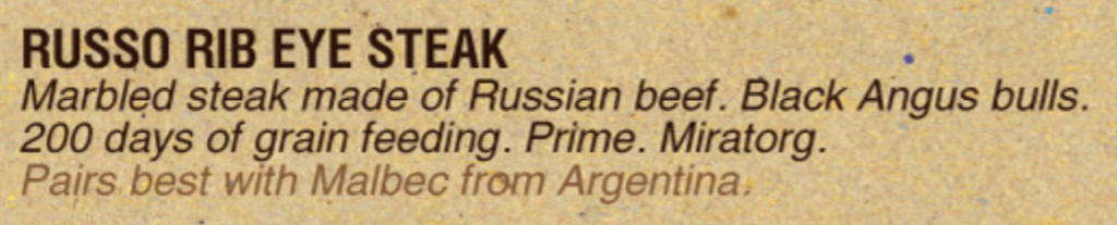 I was hoping that they would be serving Russian bred beef and I was in luck. There were also options from Argentina, Australia, New Zealand (lamb rack) and Uraguay as well.