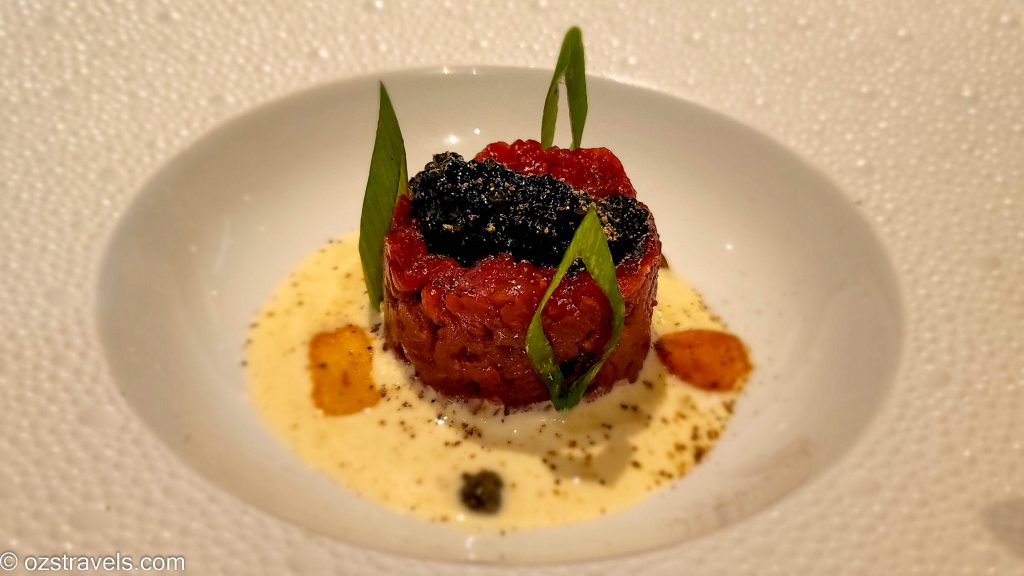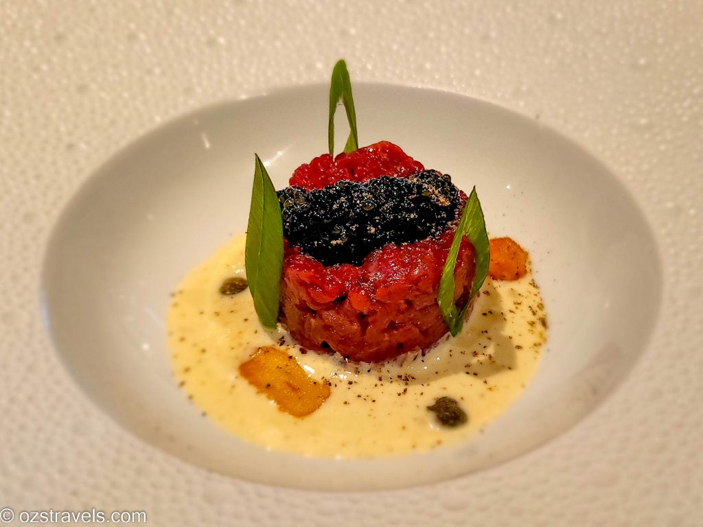 Hand-Cut Black Angus Beef Tartare, Hazelnut Oil, Sturgeon Caviar, Djion Mustard Dressing.