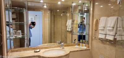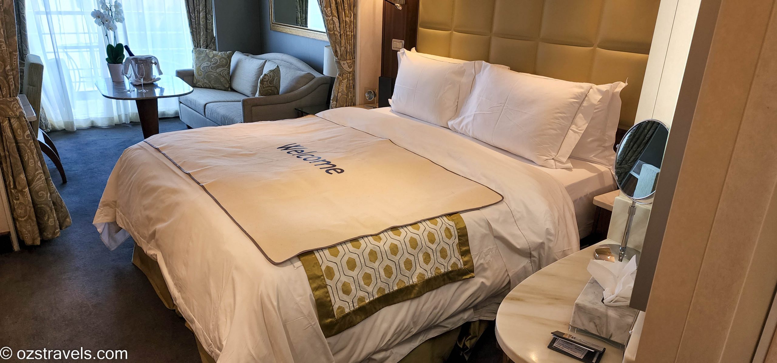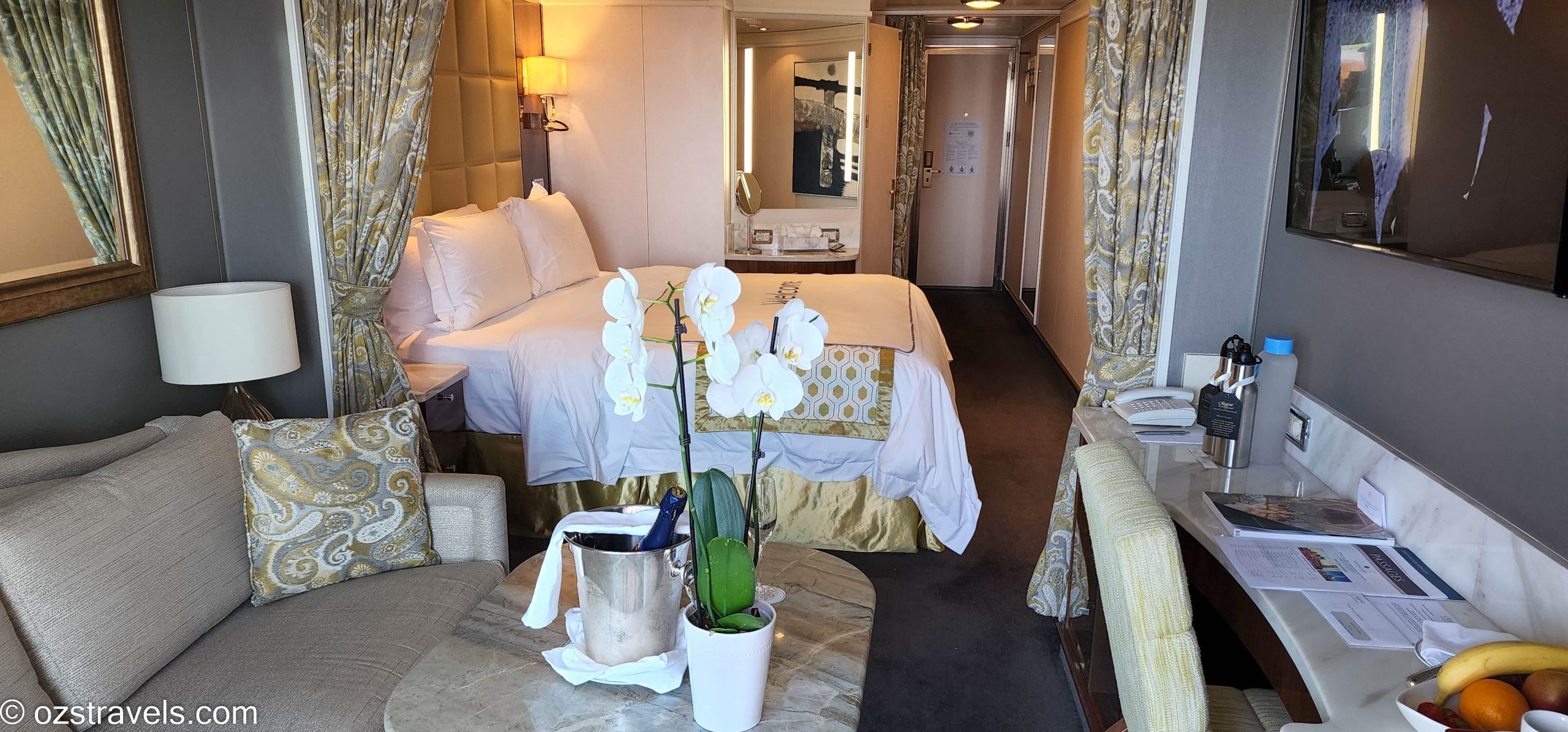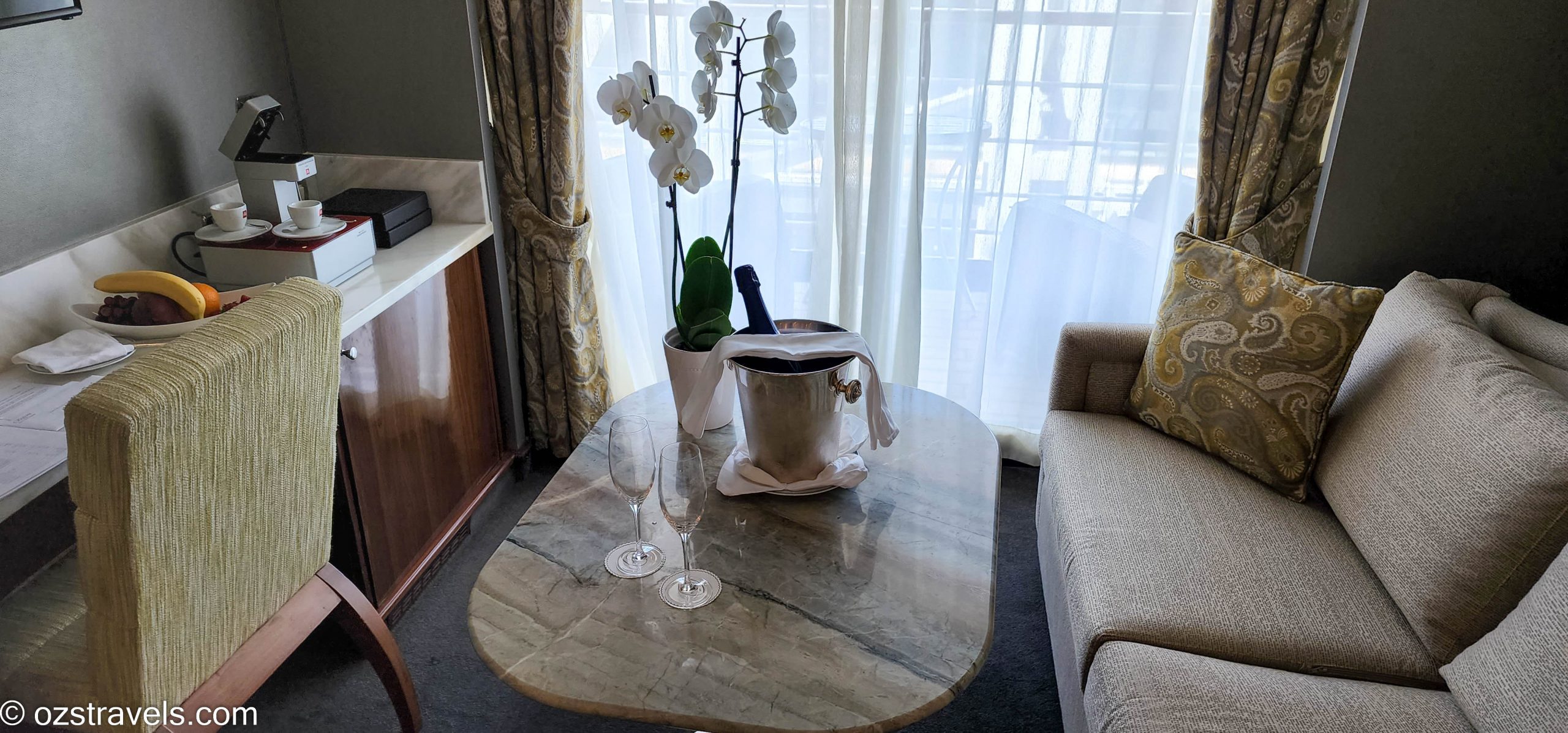 My suite is as you can see pretty comfortable and included a bottle of the ship’s house pour bubbles, a nice touch, but I did not pop the cork whilst unpacking.
