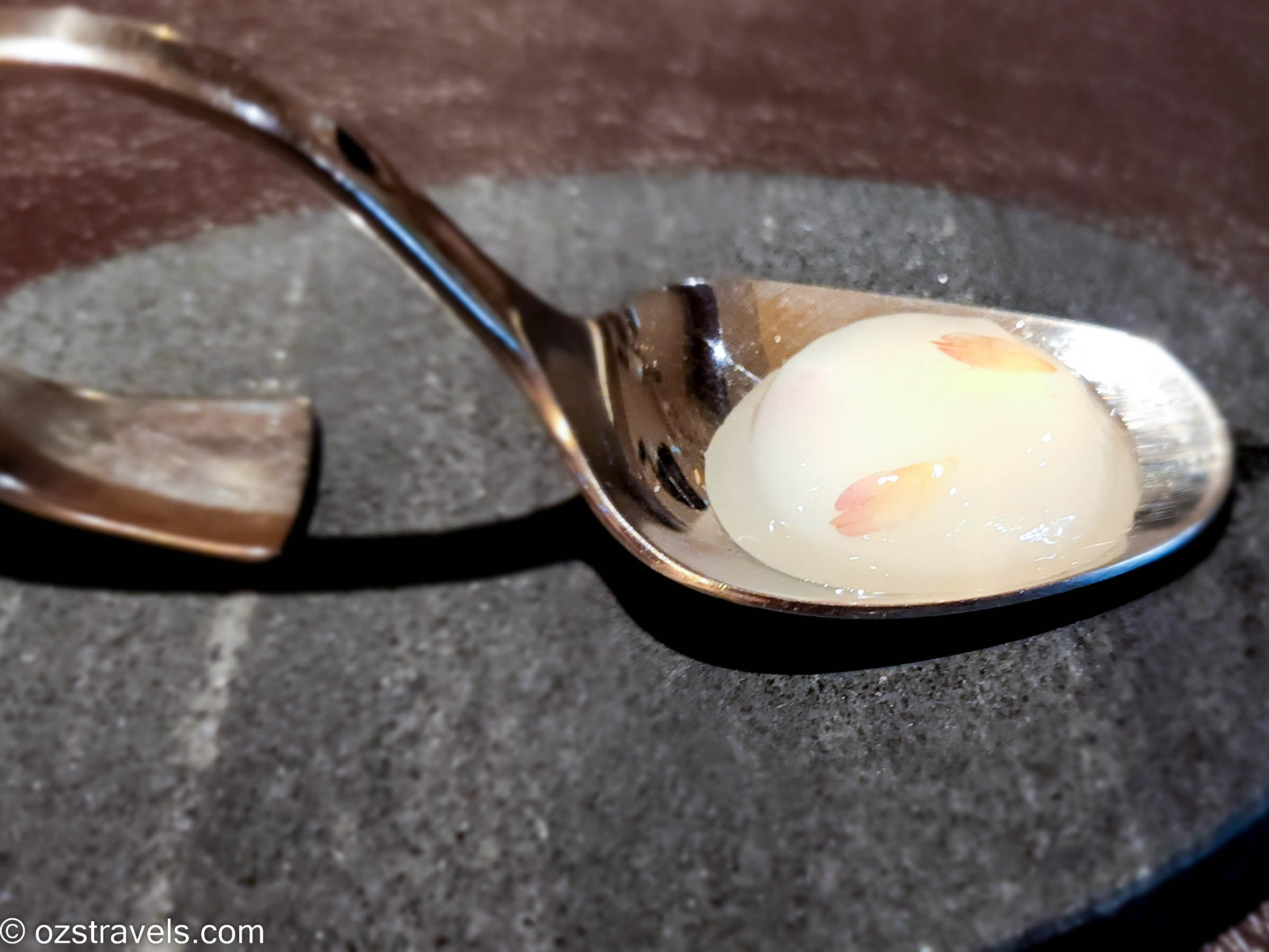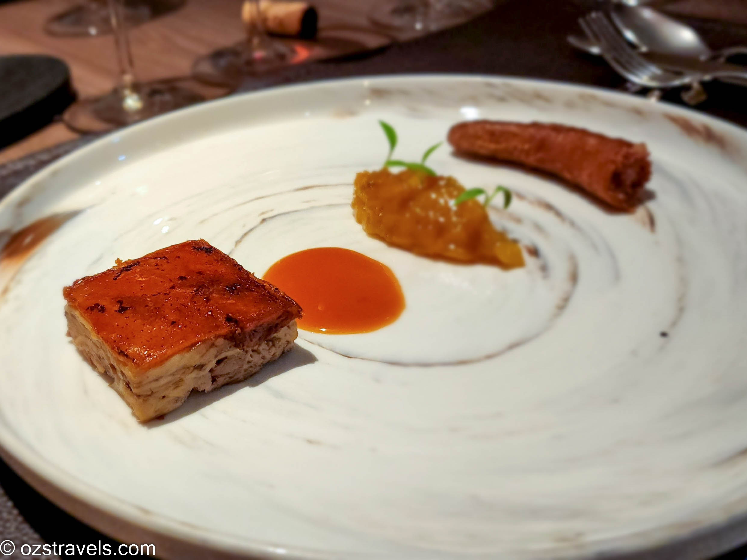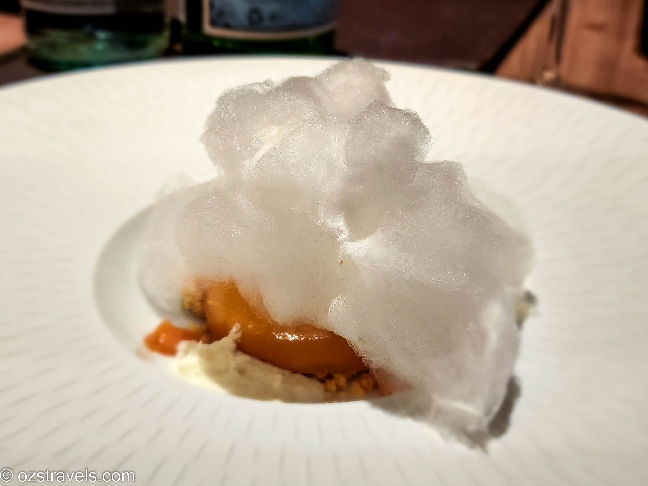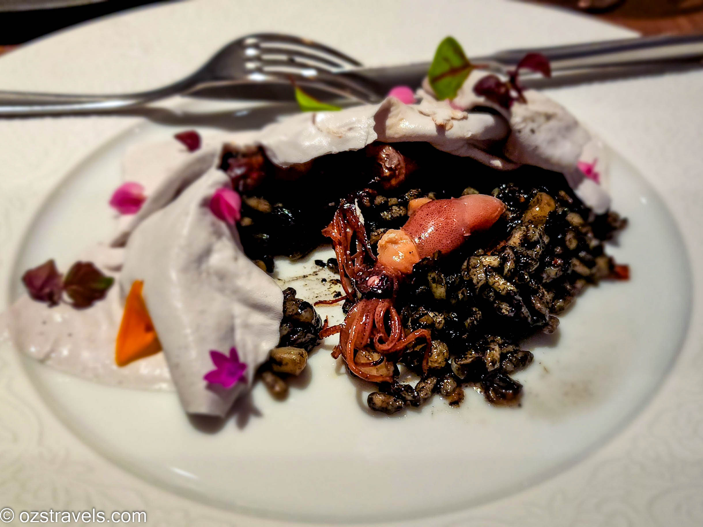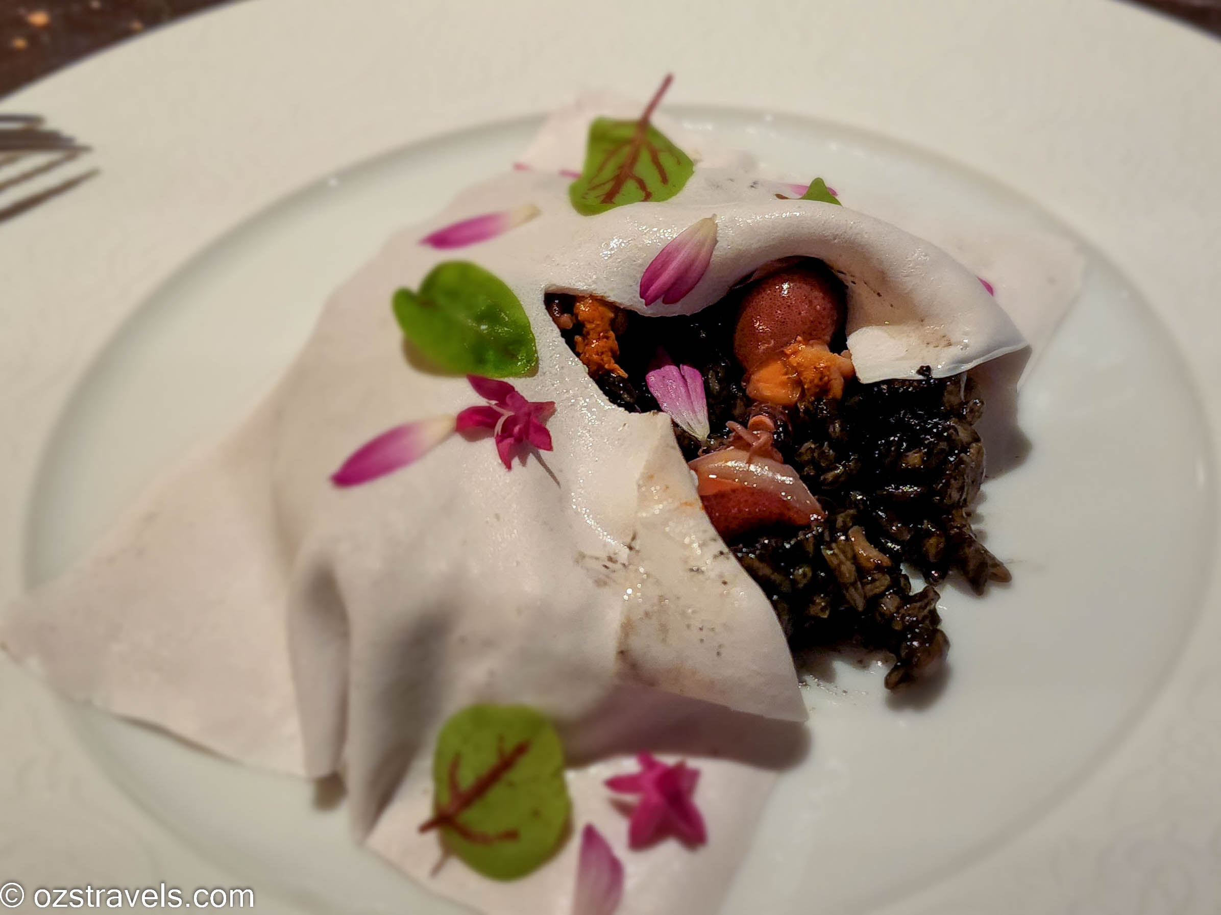 This is an interesting dish with cuttlefish and squid ink rice, the white covering includes cuttelfish (and what else I can’t remember, was too busy trying to work out how to take its picture to remember to listen). Very nice, I liked the combinations.