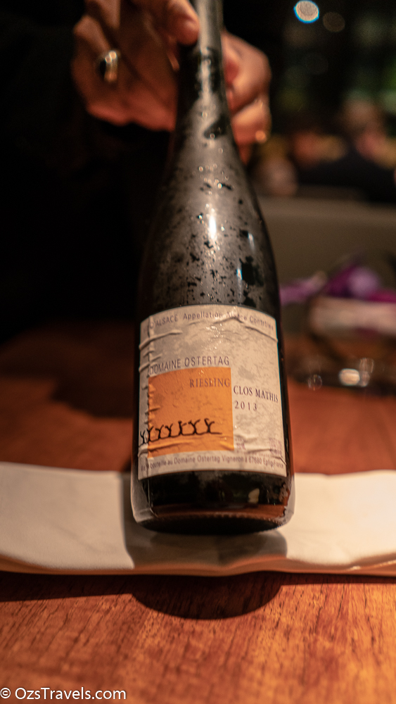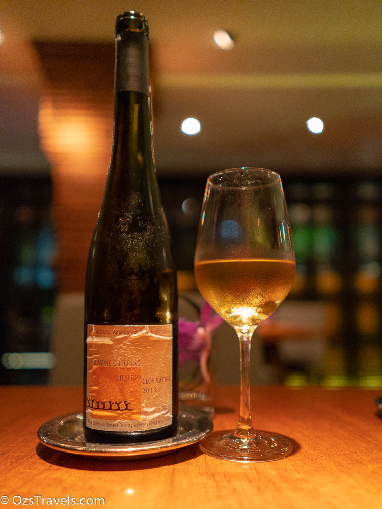 | Name: Domaine Ostertag Clos Mathis Year: 2013 Region: Ribeauville, Alsace, France Vineyard: Clos Mathis Varietal: Riesling Oz’s Wine Rating: 4 out of 5 Bright light yellow straw in appearance with a refreshing mix of grapefruit, lemon zest, lime and a slight hint of kerosene aromas. On the palate it was vibrant, complex, refreshing with just the right balance of acid and sweetness and an enjoyable medium length finish.This paired very well with the food served at Nahm. Great wine! |