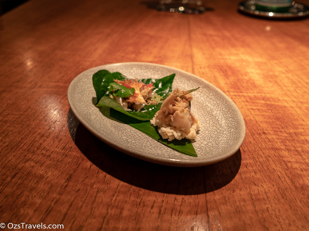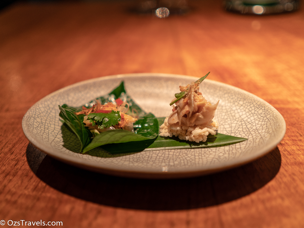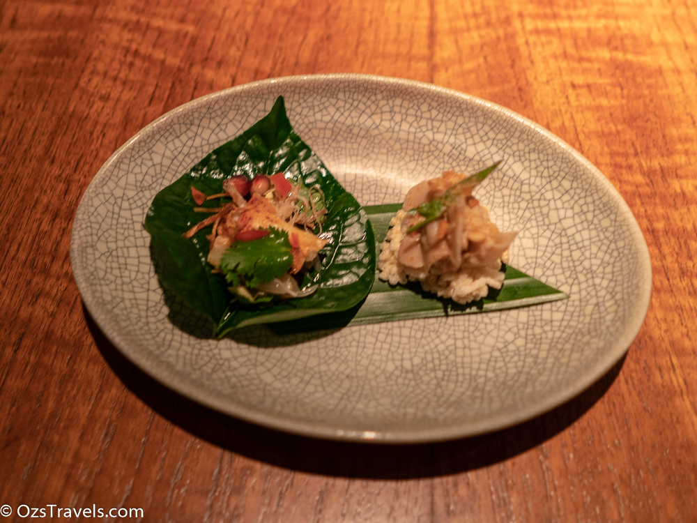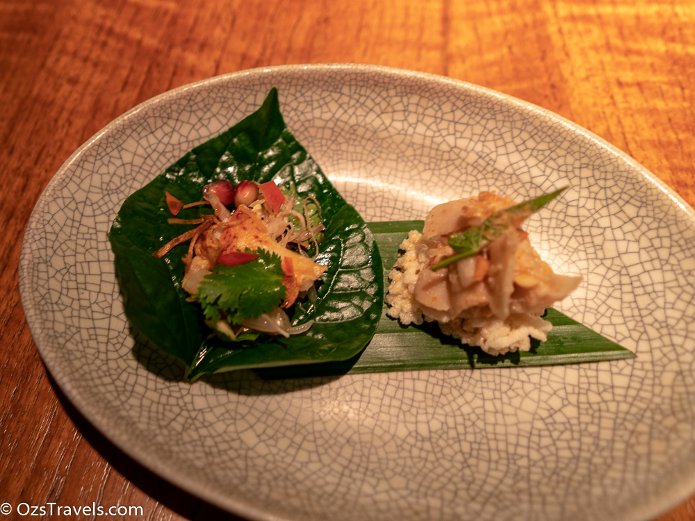 miang of lobster, chicken, green mango, snake fruit, and herbs served on thong – lang leaves (the dish on the left side)