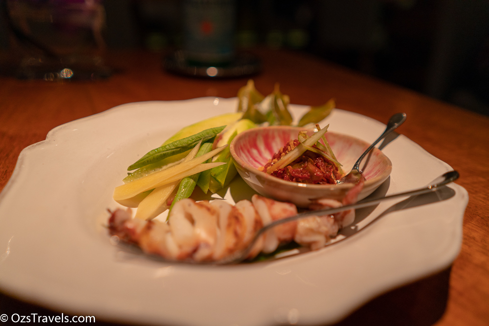 I had no idea what to expect for a “relish” course, but I like the idea (now). The squid was cooked to perfection, would make my Uncle Sid smile, very tender, wonder if they soak it in milk first. I did not find the relish to be too spicy, another nice mix of flavors. There is heat though lurking in the background just waiting for you to for you to take a big bite and then bammm there it is. YUMMMMMMMM!