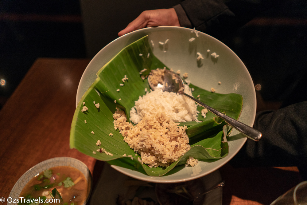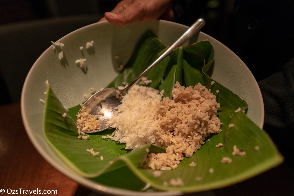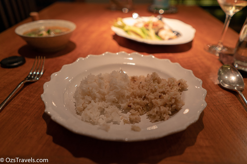 At Nahm Bangkok they serve the main courses with two different types of rice, green (which young rice) and white both are from Thailand. The textures of the two are different, the green rice was firmer than the white rice.