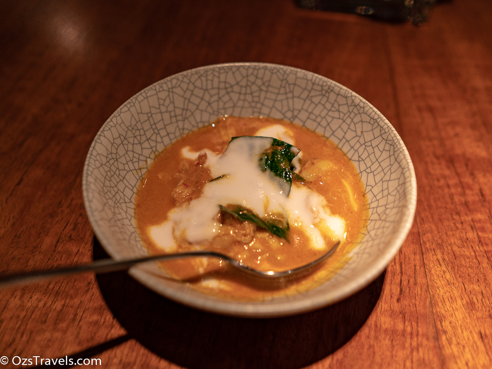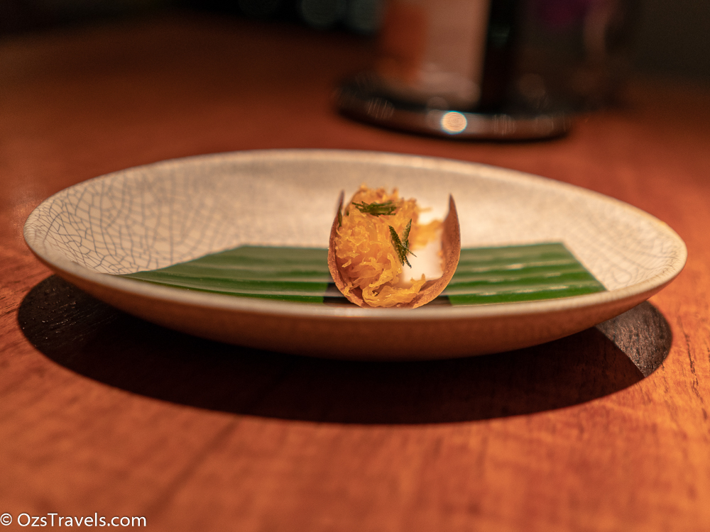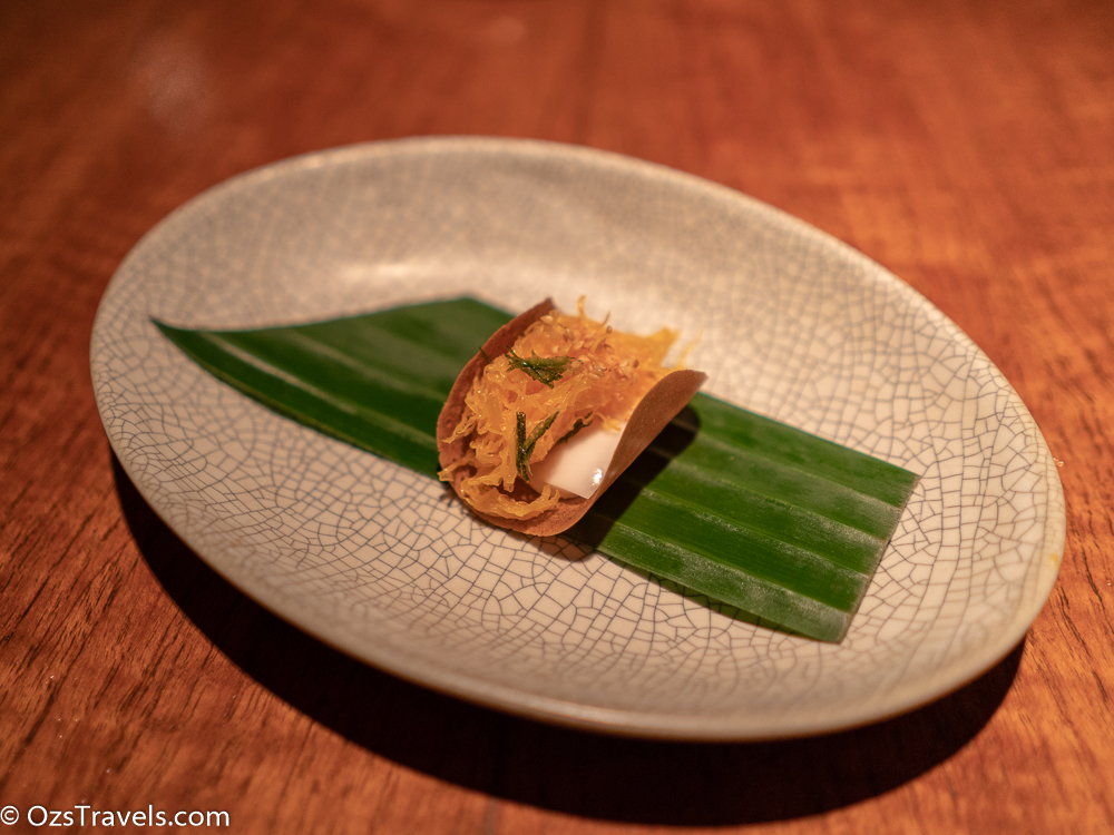 I didn’t have any dessert, ran out of room, but was given a sweet thai cracker with coconut mousse and shaved coconut, which was very tasty.