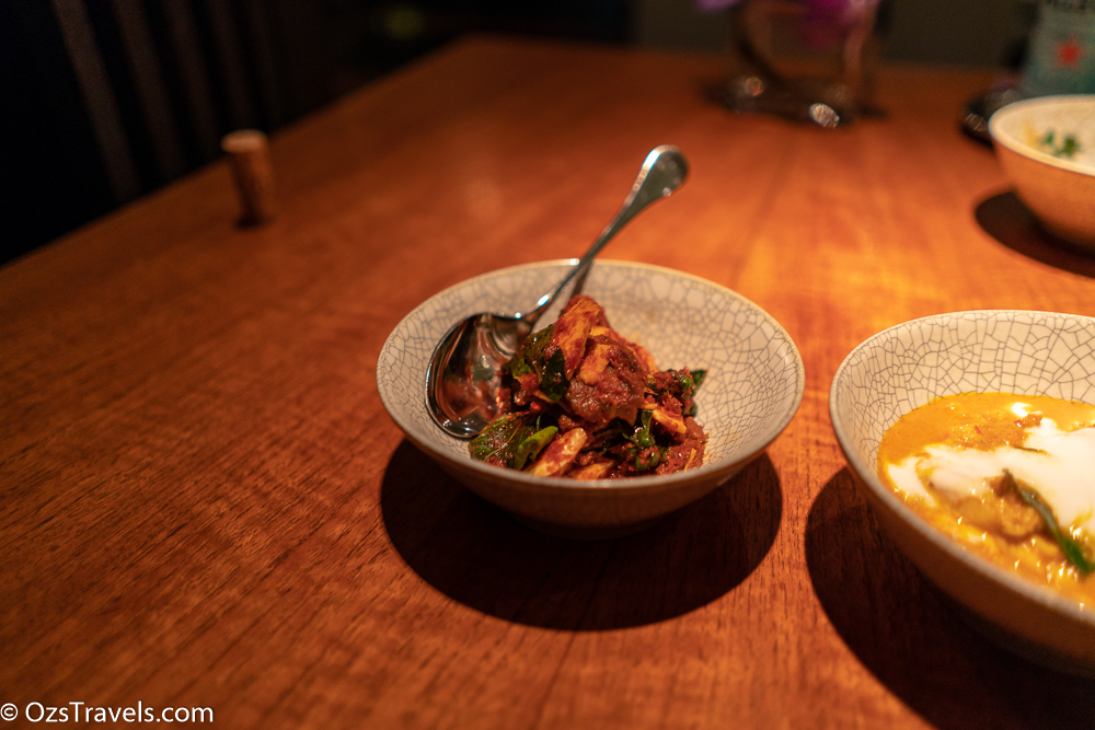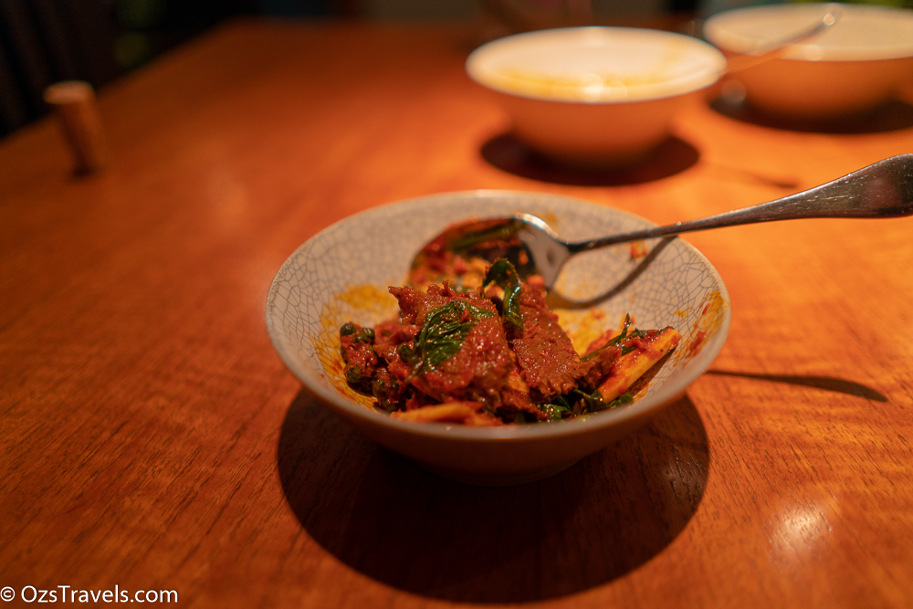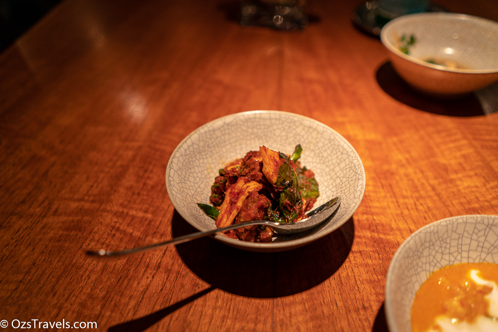 I enjoyed my experience at Nahm Bangkok, great food, excellent service and a very comfortable place to eat. A number of my friends have eaten there in the past and found it a bit too spicy, I guess they are not the only ones who found this to be the case as there were a number of “less” spicy choices on the menu. The only dish that I found over the top from a spicy level was the Angry Beef, but that was because the chili overpowered everything else.