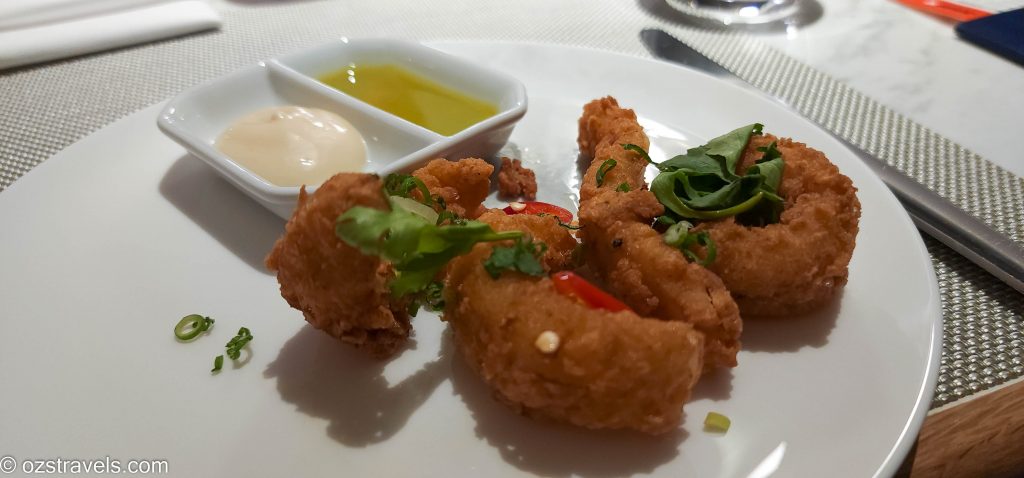 For dinner I had salt and pepper squid, pork belly and a side of chips The squid was ok, unfortunately the pork belly was lukewarm and chewy, disappointing.