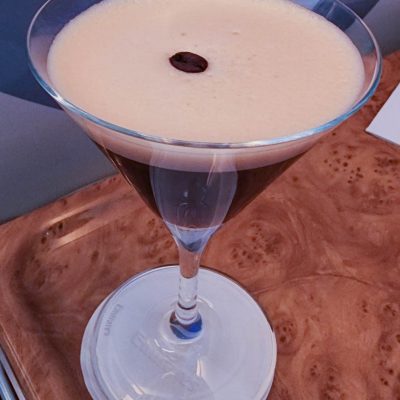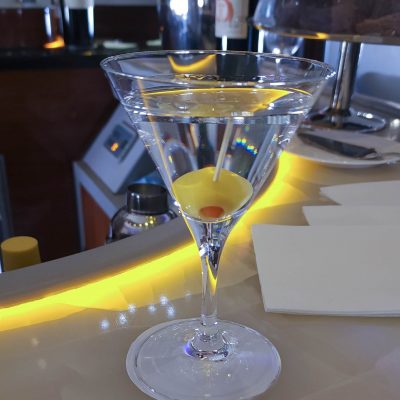 The crew member assigned to be the bar person for the flight was not able to make it for some reason so they re-assigned a crew member from the economy section to work the bar. He had never worked behind a bar before and did a pretty good job, with the rest of the crew helping him out when he needed it. His martini was very dry, not bad for his first ever attempt at making one.