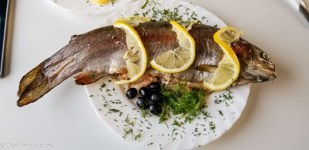 For dinner I went to the dining car for the first time. Glad I did, the food was both interesting and good. I had a baked whole trout stuffed with cheese, tomato and champignons with a side of backed potato?? Was not exactly baked though. Definitely hit the spot.