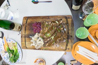 I love bbq ribs and use spare ribs because baby back have a meat to bone ratio that’s not worth the effort. The sauce is kichap manis based because whilst still smoky, I prefer the Asian flavours as compared to the tomato base bbq sauces usually associated with bbq ribs. The chye poh potato salad is robust enough to match the bbq flavours and the gula Melaka mustard is an amazing accompaniment and is my take on German sweet mustards always served with pork.”