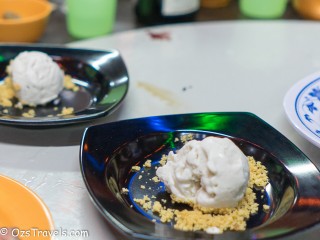 Pisang Raja Dark Rum Flambé, Almond Crumble with homemade coconut ice cream
